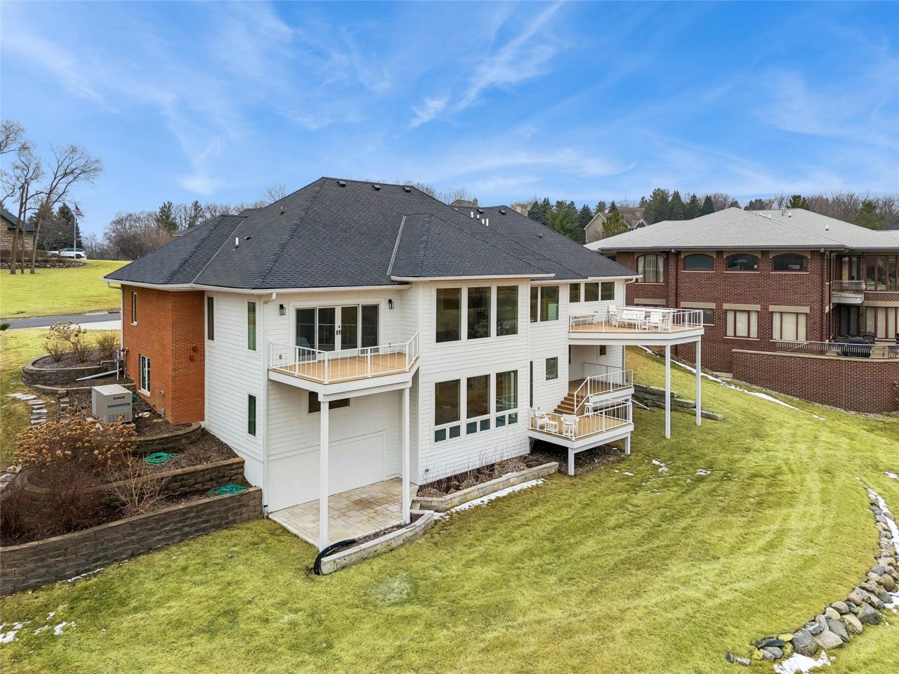 Updated walk-out ranch backing up to the Glen Oaks golf course. This 4,258 SF, 4 BR, 6 bath home was extensively remodeled in 2022-2024. Updates include a new roof, siding, drywall, elevator, chairlift, all Anderson widows, trim, doors, full kitchen including Sub-Zero refrigerator, Dacor stove and dishwasher, all baths, all flooring and four decks. The floor plan includes two main floor offices, theater room, formal dining room, family room, roomy kitchen, primary bedroom with large walk-in closet, primary bath with zero entry shower, tub and two vanities. The walk-out lower level has 3 more bedrooms, each with it's own bath, sunken family room with a wet bar, hal bath and second laundry hookups.  There are two new geothermal furnaces with backup natural gas forced air furnaces plus a tankless hot water heater. This home is not just like-new and it is almost all-new.